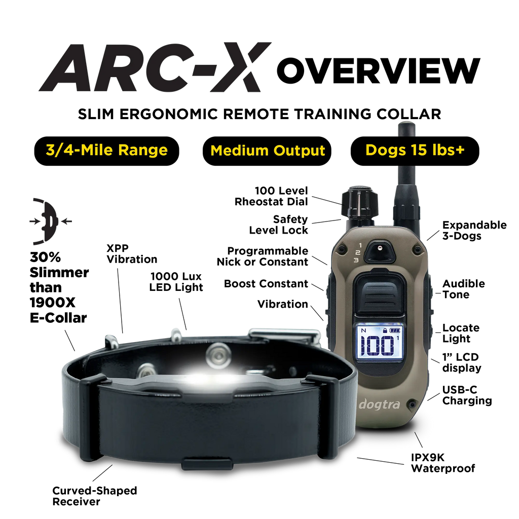 Dogtra ARC-X steht für modernes, professionelles Hundetraining in kompakter Form. Mit seinem ergonomischen Design und nur 78 g Gewicht. Der optimierte Handsender liegt sicher in der Hand und ermöglicht eine intuitive, präzise Steuerung auf bis zu 1,2 km Reichweite.